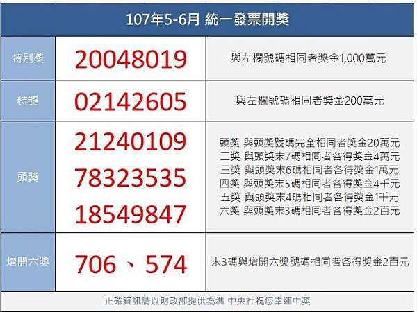 今年5、6月統一發票中獎號碼: