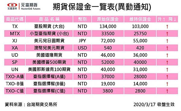 元富期貨郭靜宜(小靜)【2020年3月17日台灣期交所調漲 期貨保證金/大台134,000元/小台33,500元/選擇權賣方保證金A、B、C值】海期開戶洽詢0958029758